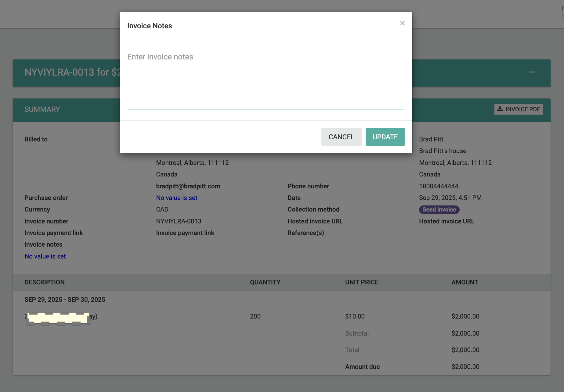 We’ve introduced the ability to add and update invoice notes directly within the invoice view. These notes are saved to the invoice record and will also appear in the PDF version.
