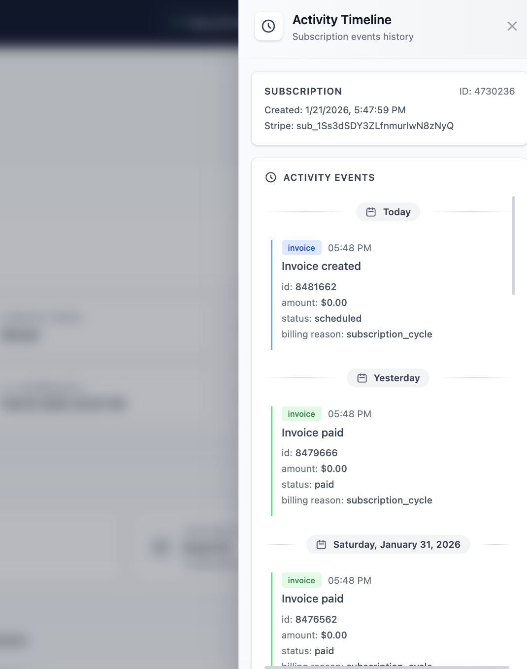 - Admins can view a chronological history of subscription-related events and changes in one place.