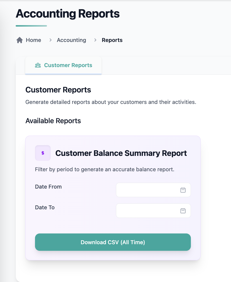 You can now view a consolidated summary of all customer balances directly within the Accounting → Reports tab — no need for manual exports.