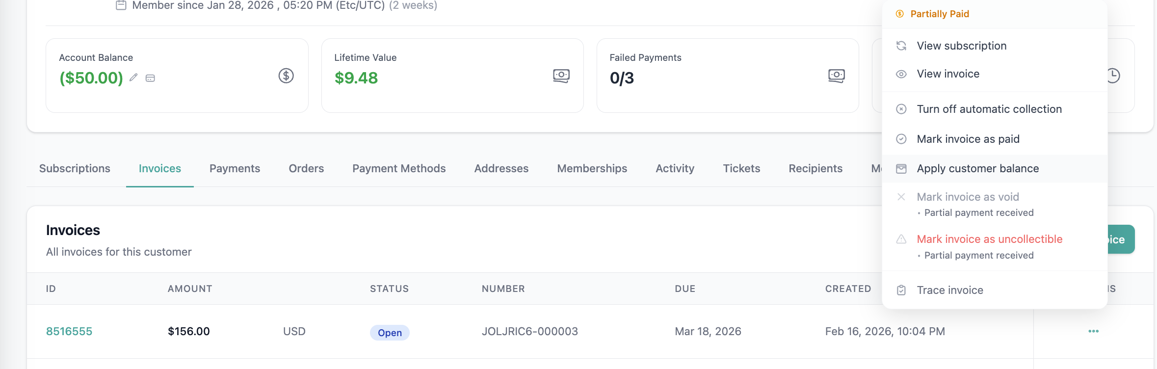 - A new “Apply Customer Balance” action is available in the invoice actions dropdown on the customer's profile page.