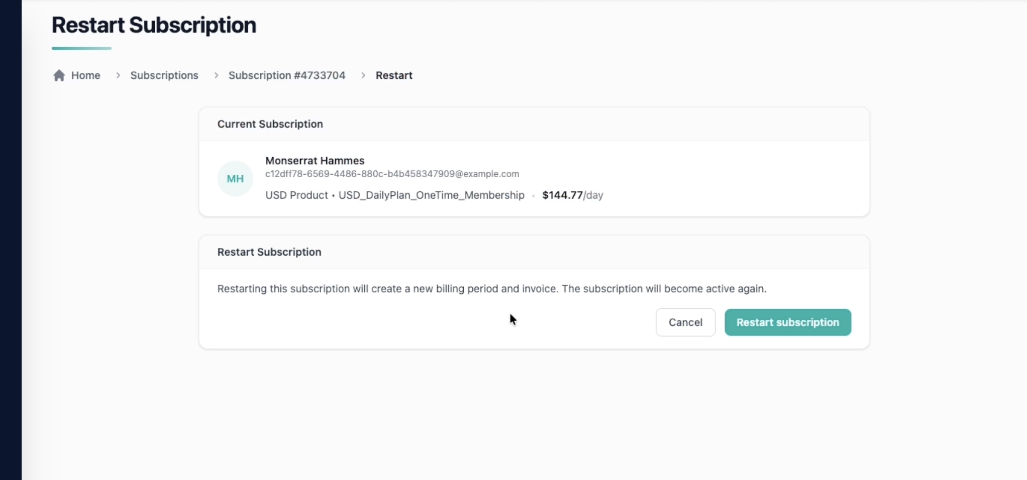 - An invoice is generated on the restart date