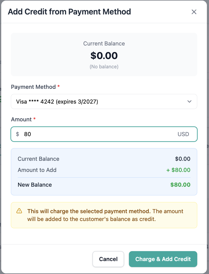 We’ve introduced support for charging an existing saved card and applying the funds directly to a customer’s balance, eliminating the need for external charging workflows and manual reconciliation.