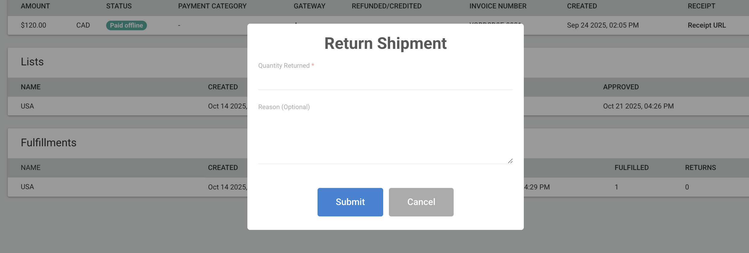 💡 Why It Matters This enhancement introduces a structured and auditable way to manage product returns — improving operational accuracy, reducing manual tracking, and ensuring that fulfillment data remains consistent across the platform and reporting.