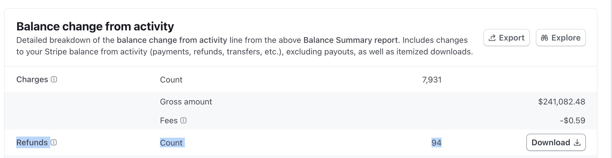- Export Pelcro’s Refunds Report and your payment processor’s Refunds Report for the same date range. For example, if your payment processor is Stripe, you can view refunds by navigating to Balance Summary > Balance Change from Activity > Refunds Report for the corresponding date range.
