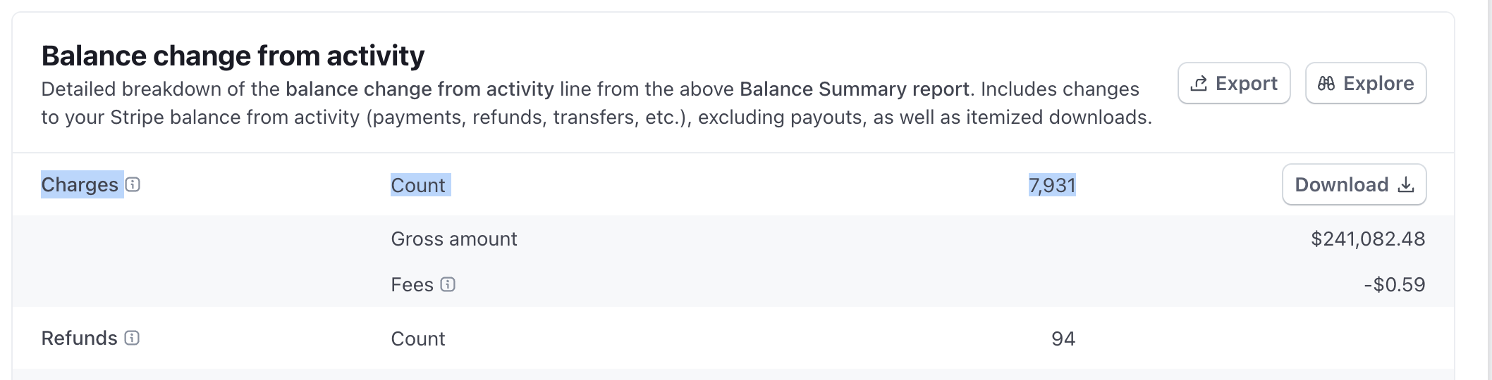 This represents the gross online payments and refunds recorded for that period in Pelcro. - From your payment processor’s dashboard, export the Transactions Report (sometimes called Balance Transactions, Processed Payments, or Activity Report) for the same period. See below an example of the Stripe Balance Summary report for getting the online charges report.