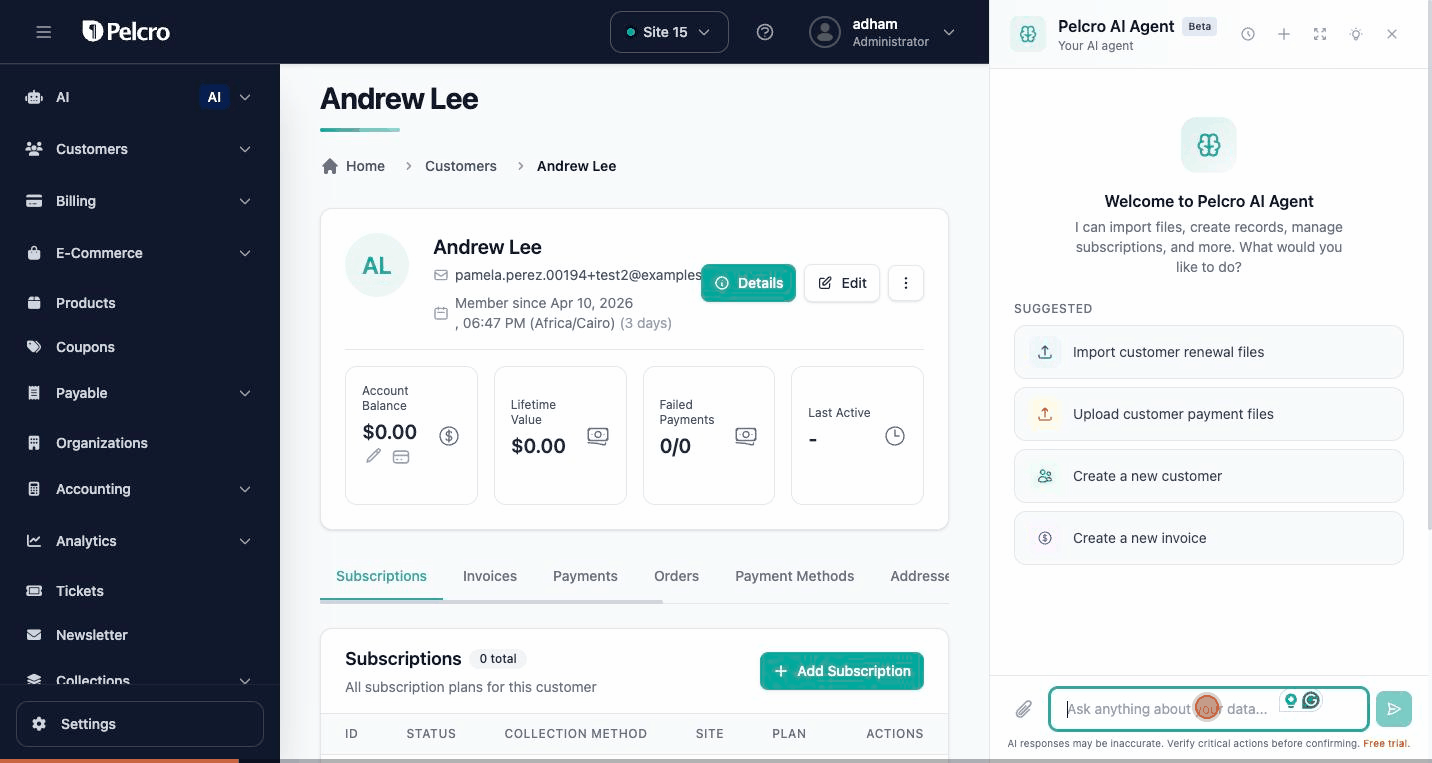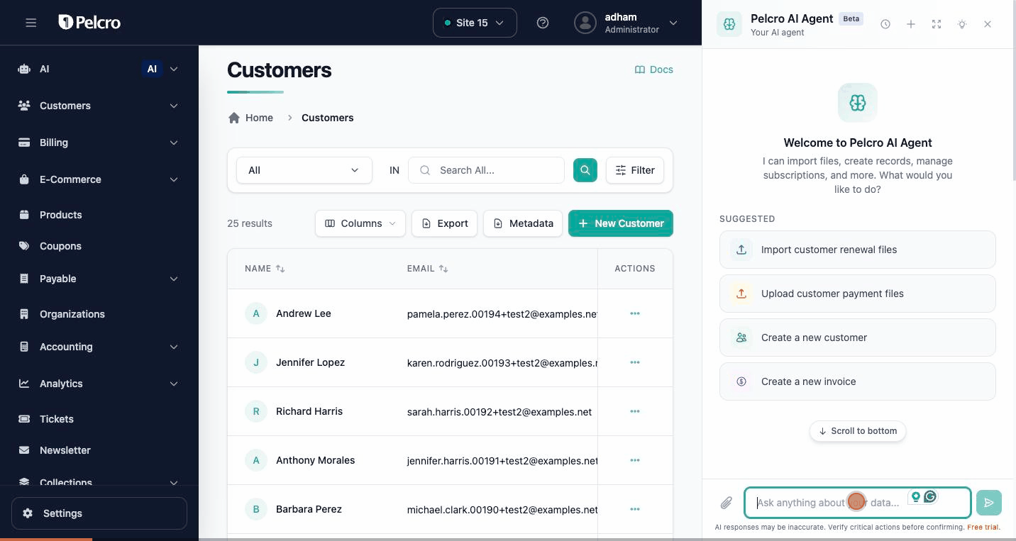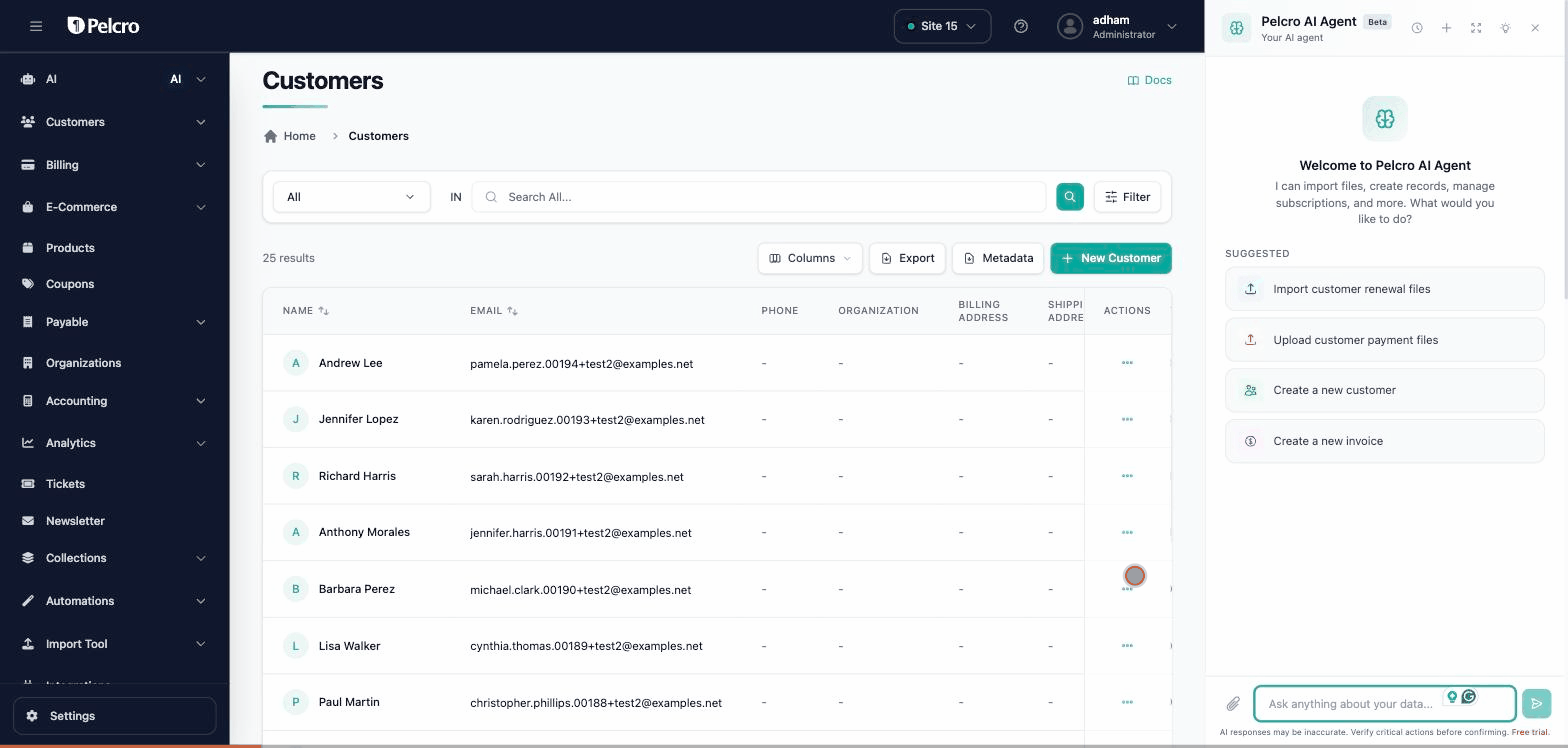 It is powered by Claude (Amazon Bedrock) and has direct, verified access to your full Pelcro account — customers, subscriptions, invoices, charges, and more.