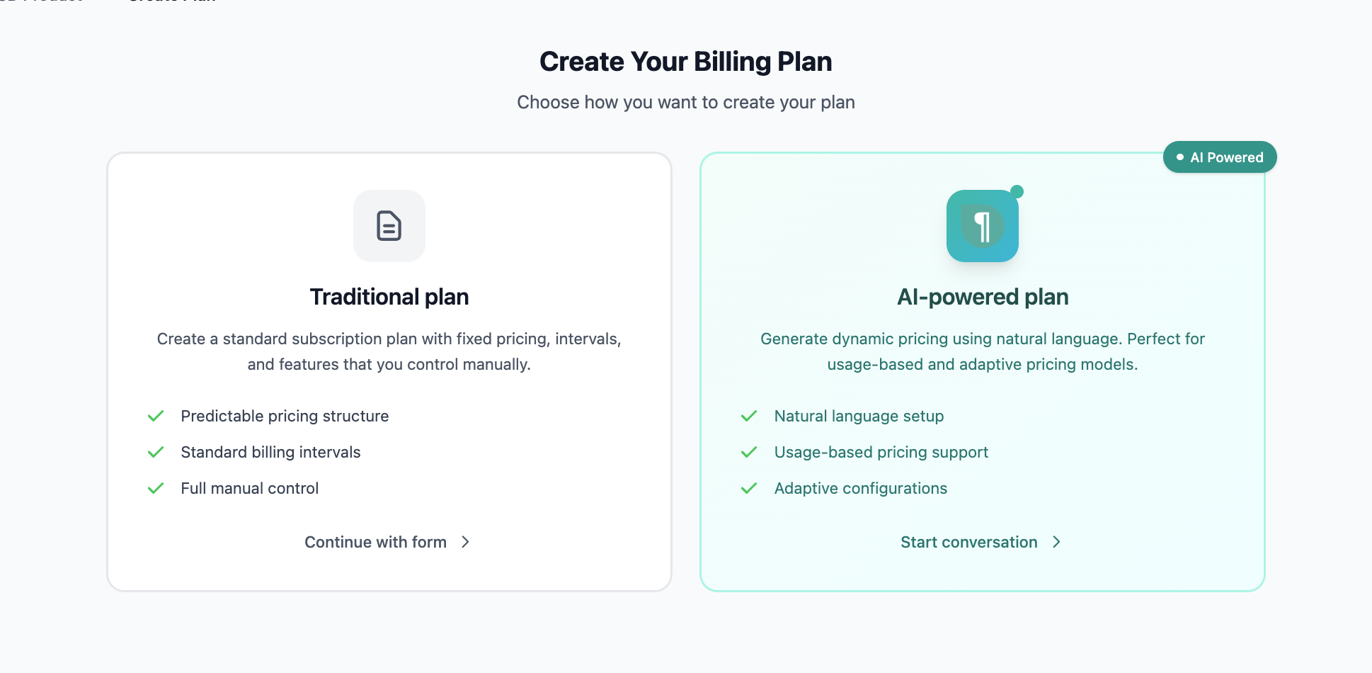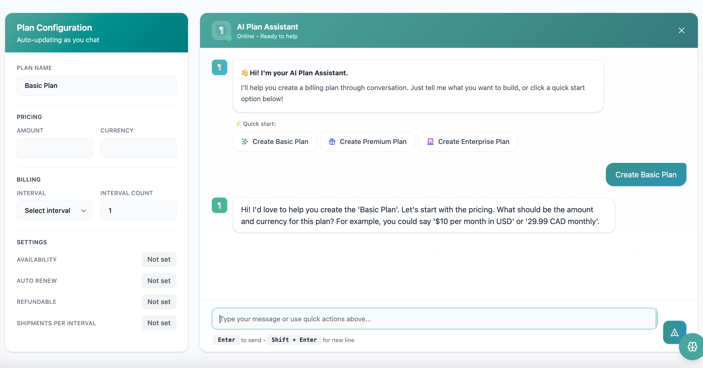1. AI Plan Creation — A conversational chat panel that lets you build a subscription plan by describing it in plain language. As you chat, the plan configuration updates in real time on the left side of the screen. No forms, no dropdowns — just describe what you want.