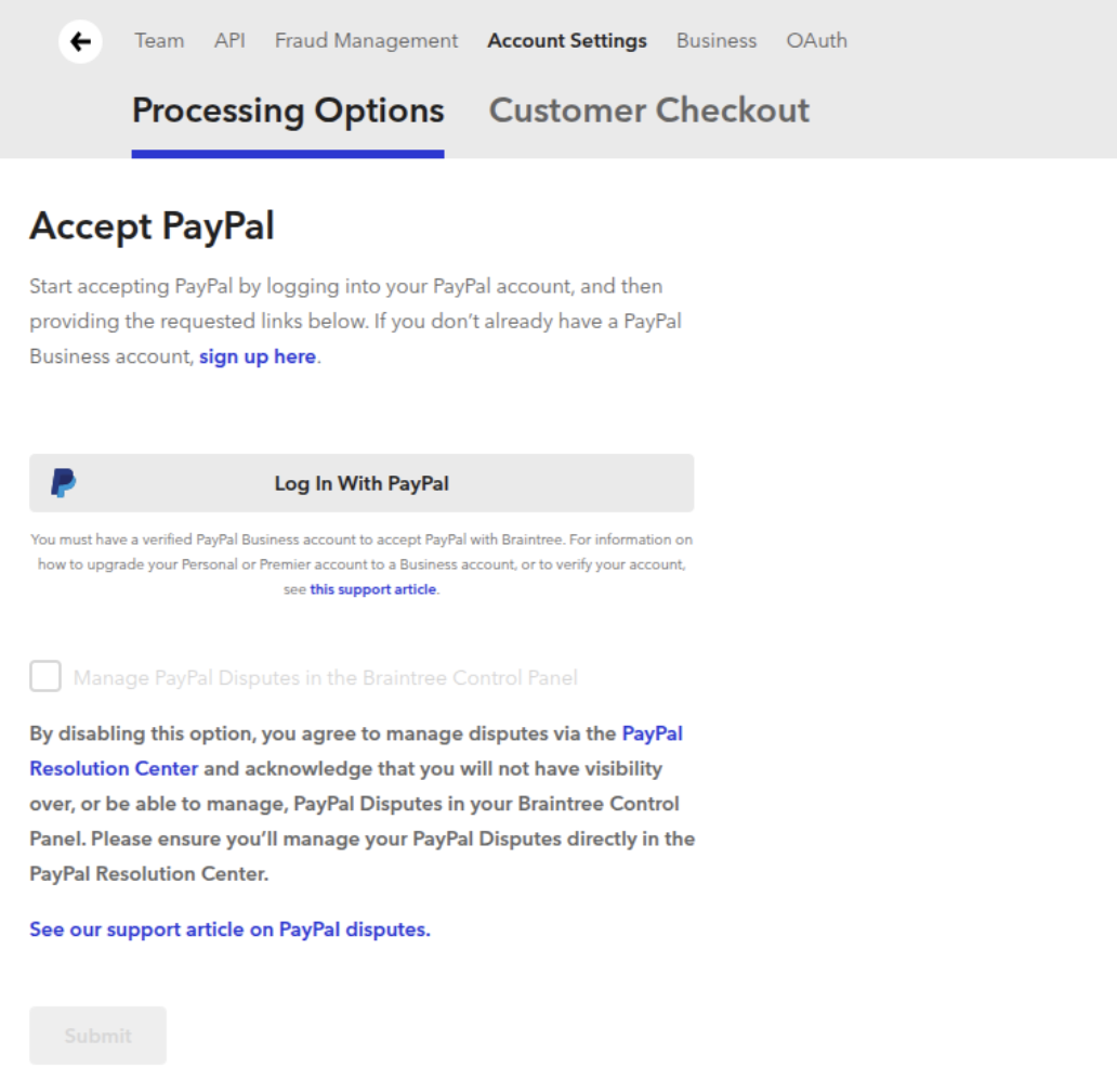 - Click “Log in with PayPal” to link your PayPal Business account.