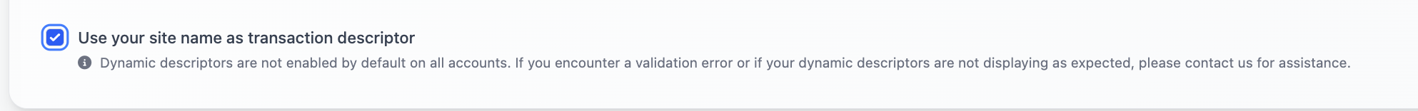 Regarding transaction descriptors, if the descriptor flag is enabled, your site name will be passed in the transaction. However, please note that dynamic descriptors are not enabled by default on all accounts. If you encounter a validation error or if descriptors do not display as expected, please contact us for assistance.