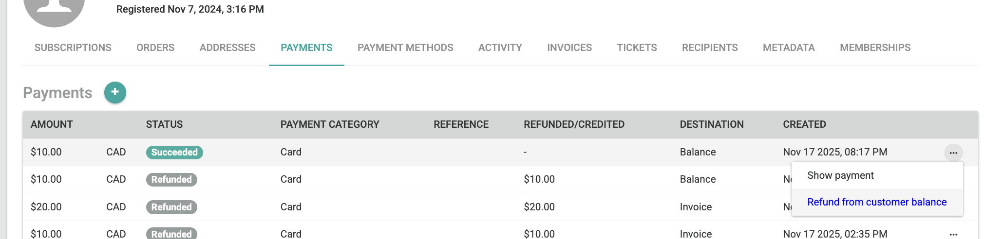 Pelcro supports refunding directly from a customer’s balance to the original payment method when the payment destination was the customer balance.