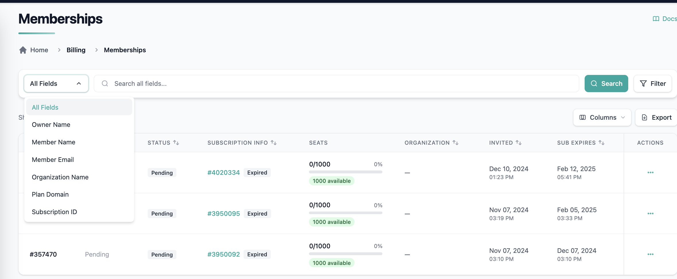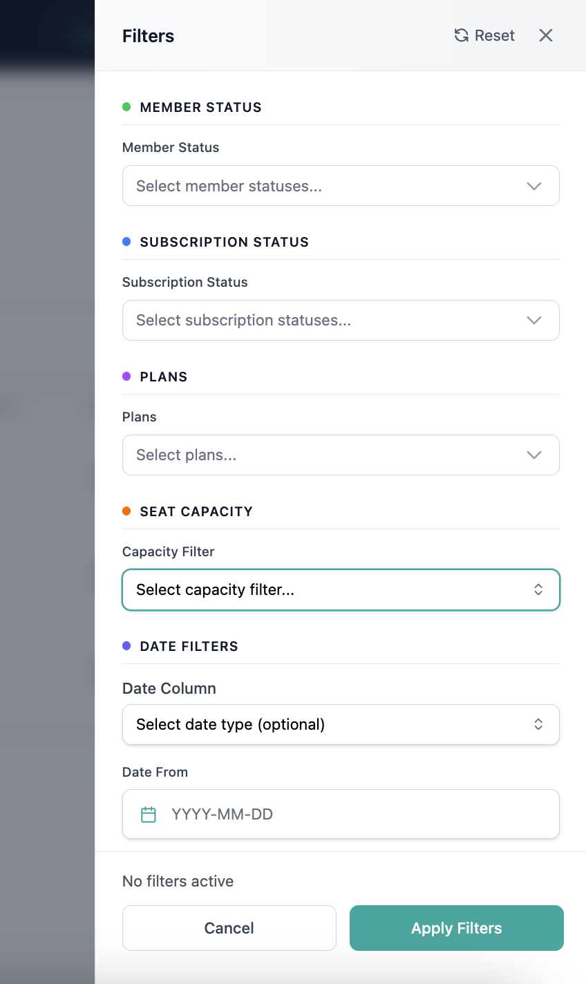 Seat Capacity | Filter memberships based on seat usage and capacity (e.g., memberships with available seats or fully utilized memberships). |