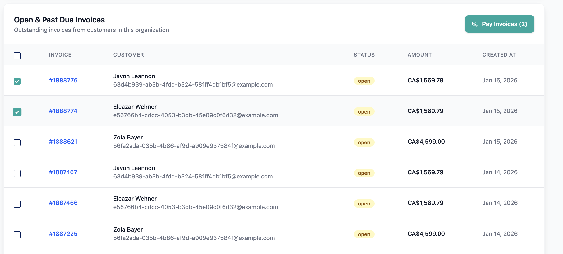 A table displaying open and past-due invoices for the organization: