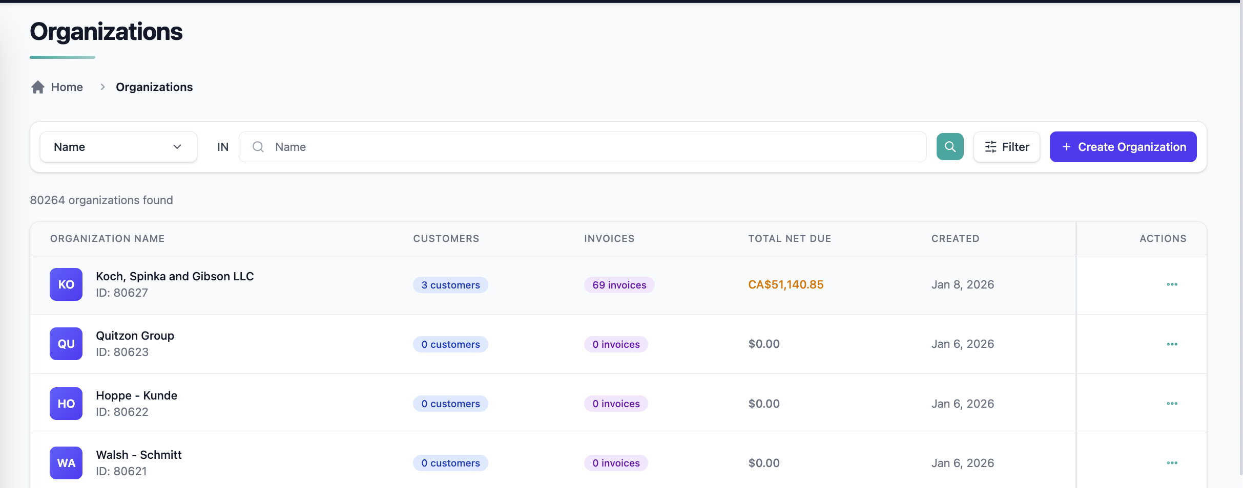 This view helps teams quickly identify organizations with outstanding balances or high activity.