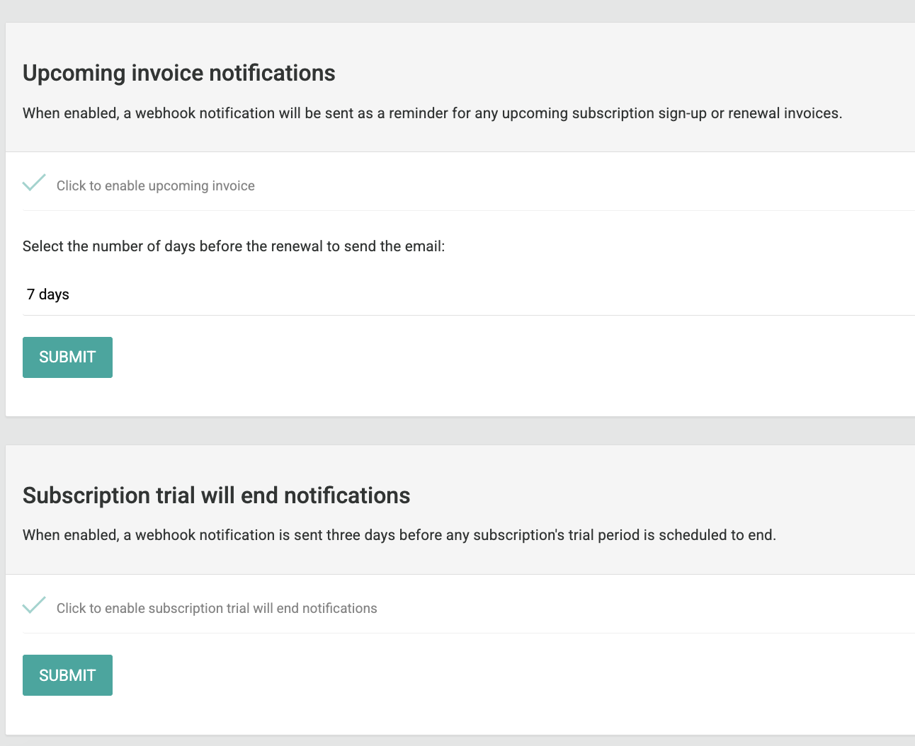 webhook to send trial-ending emails. - Go to Settings → Billing and enable Upcoming Invoice Notifications to trigger the