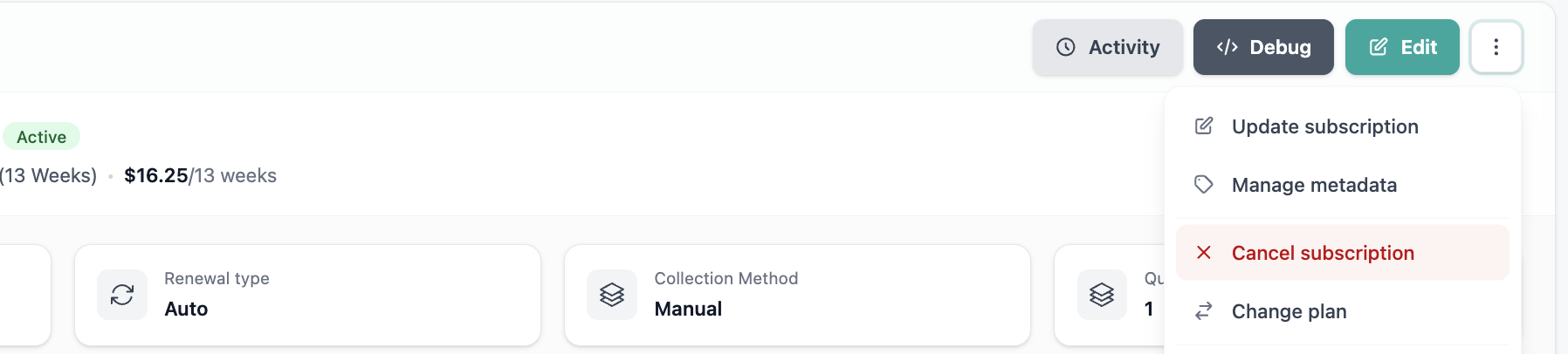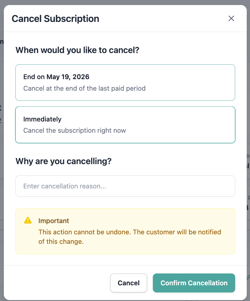 - Enable customers to cancel subscriptions immediately from their dashboard.