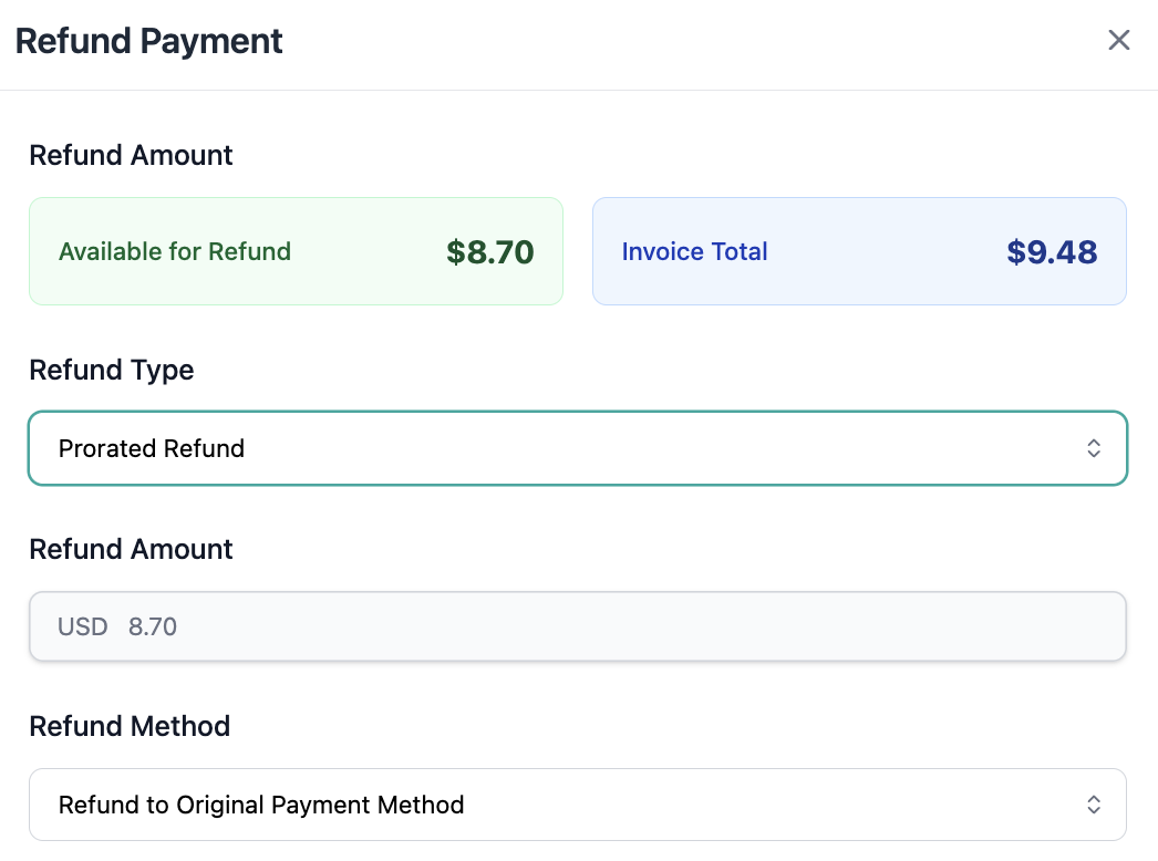 - The calculated prorated amount is automatically displayed during the refund flow.
