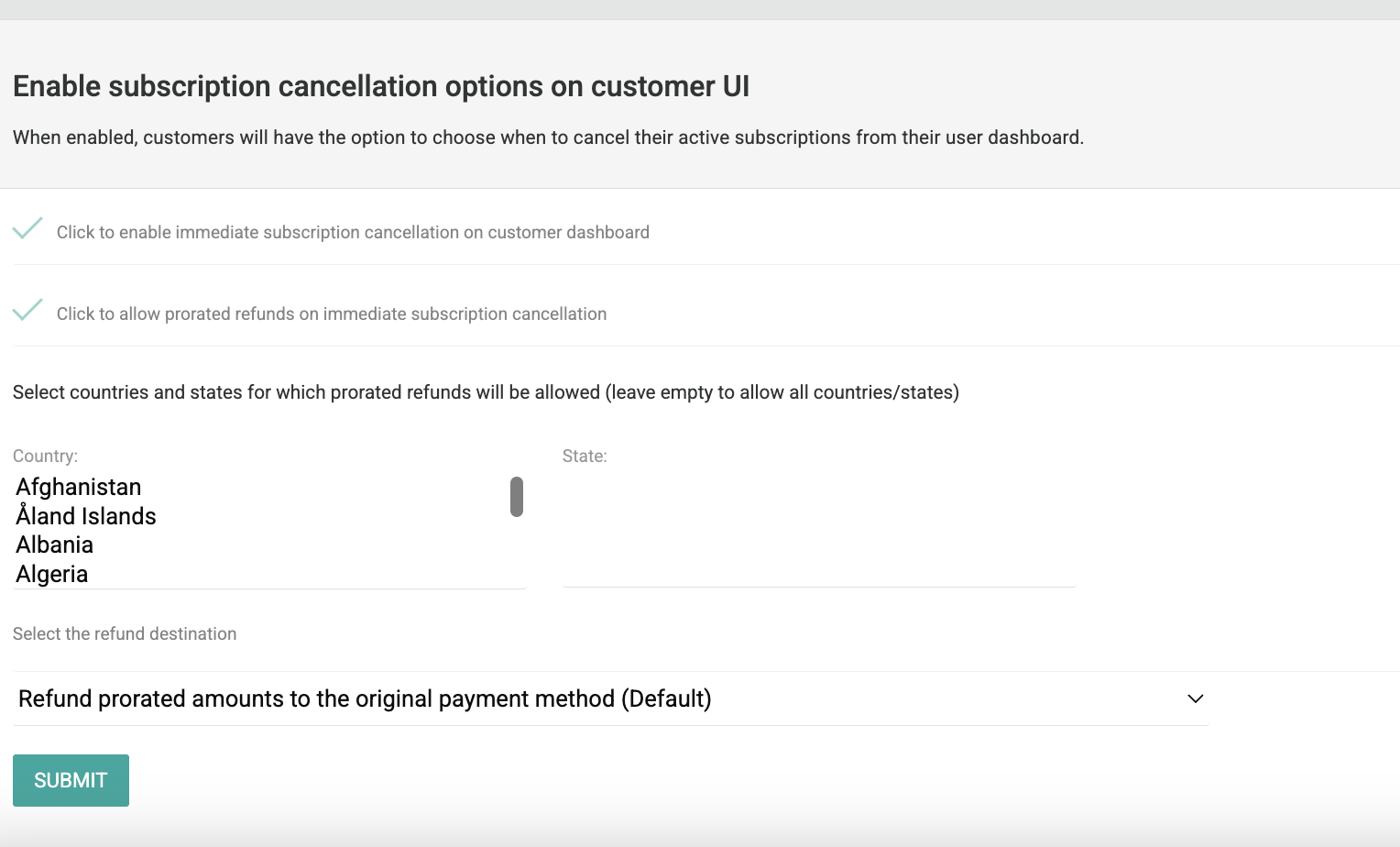 - Restrict prorated refunds by country or state (leave empty to allow all regions).