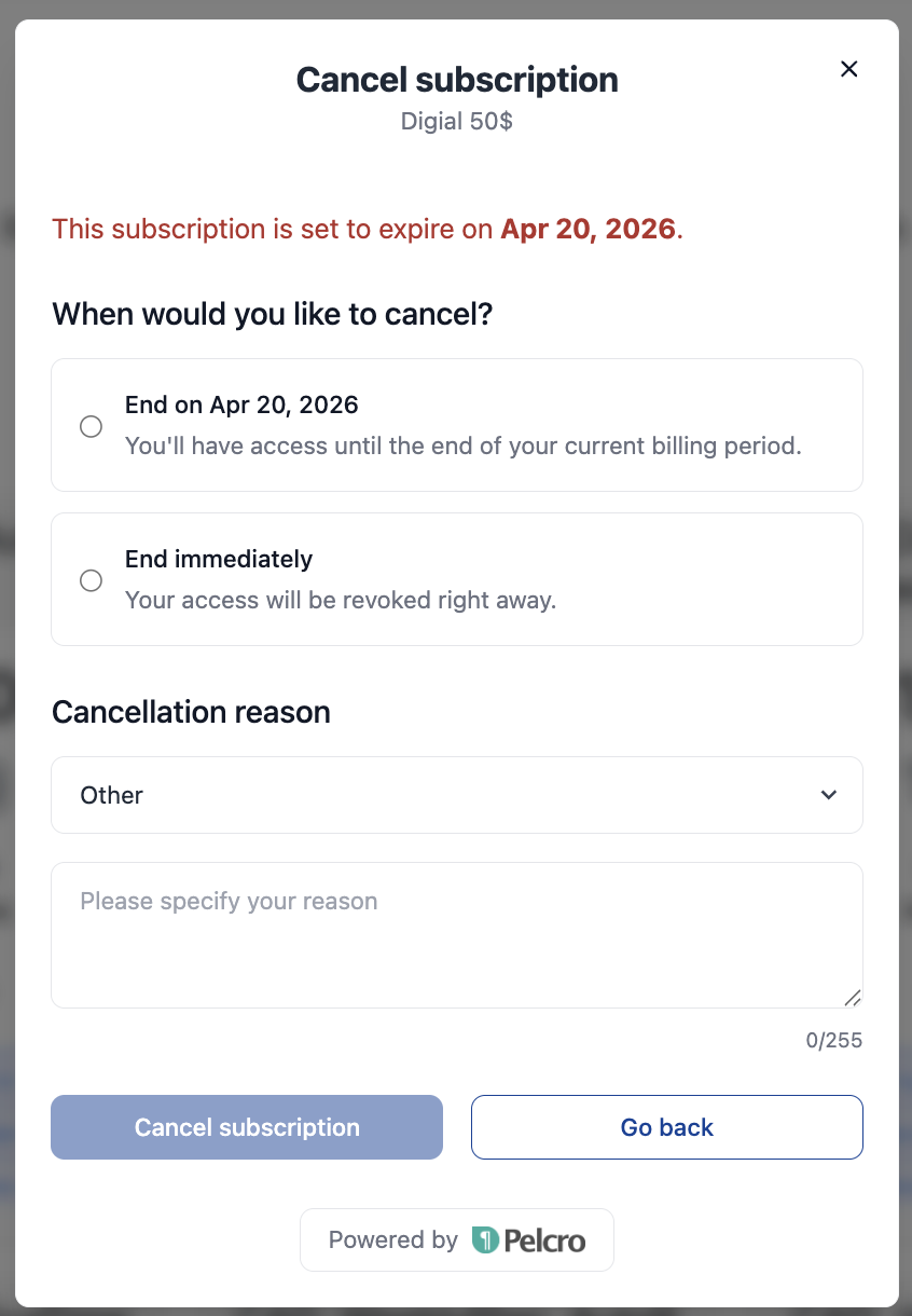 You can set up cancellation reasons, refund behavior, and immediate cancellation—refer to the Subscription Documentation for further details.