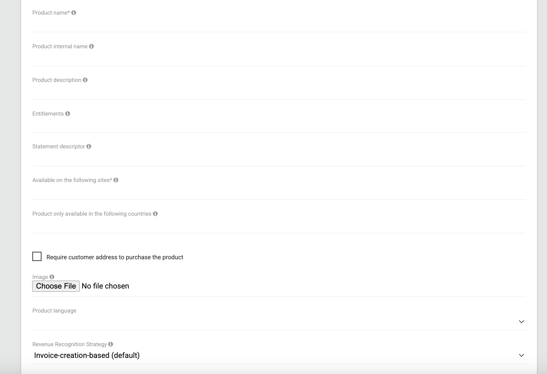 - Address Required: A checkbox that requires customers to enter their address when selecting this product. This is typically used when the product needs to be shipped to a customer. Note that even if this field is not checked but the taxes are enabled on the account, the customer will be asked to provide their address information as well.