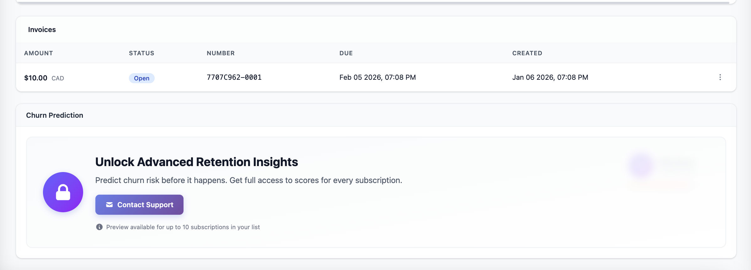 Churn Prediction Score: This helps you identify subscriptions that are at higher risk of cancellation, allowing teams to take proactive retention actions before churn occurs. You will need to contact [email protected] to activate it for your account.